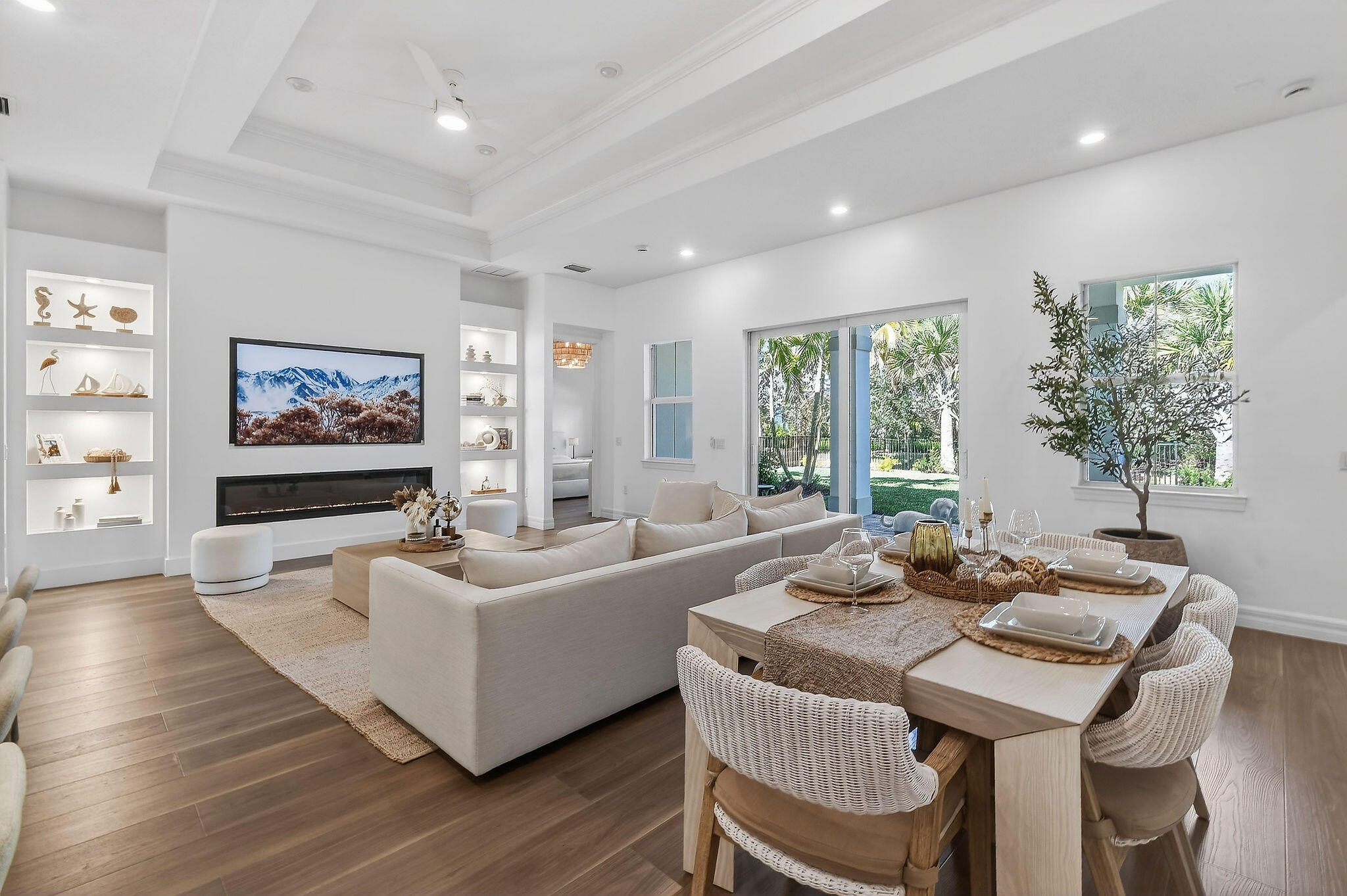 DescriptionBeautiful 2024 construction, 3 bed/2.5 bath + den, home featuring a 2 car garage and approximately $150,000 in upgrades. This thoughtfully designed layout places the kitchen at the center of the home, overlooking the caf area, living room, and spacious backyard ideal for everyday living and entertaining. The home offers a private owner's suite and guest suite, both with abundant natural light and spacious walk in closets. The kitchen showcases an oversized island, stainless steel appliances, walk in pantry, upgraded 42'' cabinetry, quartz countertops, and soaring 10'8'' ceilings. Additional highlights include a large laundry room, ample storage, Smart Home technology, and a beautifully appointed owner's bath with an upgraded tile shower and glass enclosure. Full Upgrades List Includes: Wide plank water resistant wood flooring throughout Custom wine and coffee bar with designer finishes Master bathroom fully renovated by interior designer with floor to ceiling tile Designer guest bathroom with floor to ceiling tile and custom oversized drapery Pool coded privacy fencing enclosing entire backyard Custom 12 foot built in for fireplace and entertainment center with integrated ambient lighting Oversized 12 foot kitchen island with upgraded granite, matching wine/coffee station Oversized kitchen and gold kitchen faucet and pull down sprayer Upgraded faucets in all bathrooms Statement coastal pendant lighting above kitchen island Statement chandeliers in the master suite, main living area, and one additional bedroom Oversized designer ceiling fans on terrace and main living area Tesla charger professionally installed Custom pull down attic staircases for easy access and added storage Smart front door with Ring camera and fingerprint access lock Gas line pre installed and ready for future outdoor kitchen installation